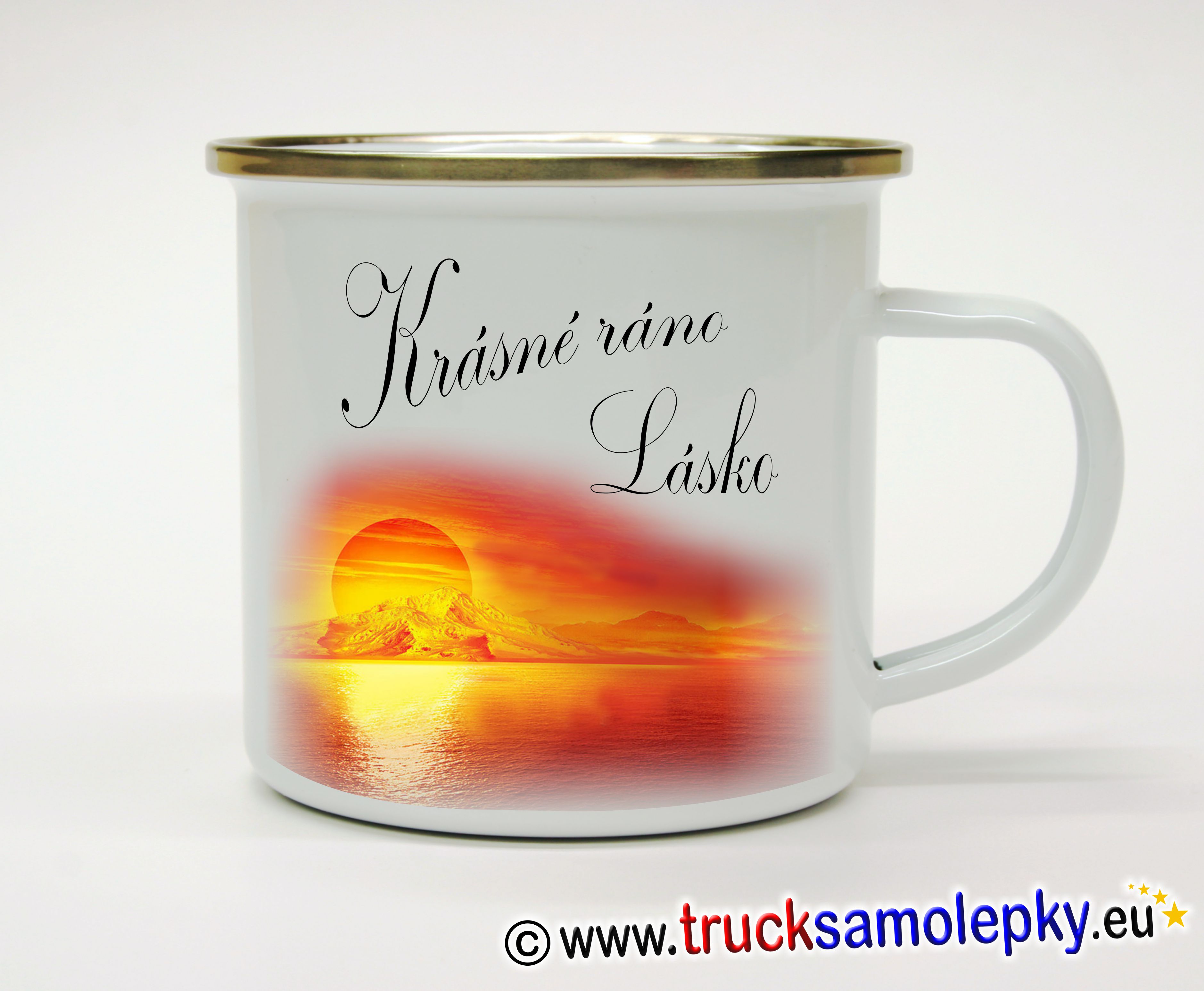 Plechový hrnek 360 ml se stříbrným lemem a potiskem